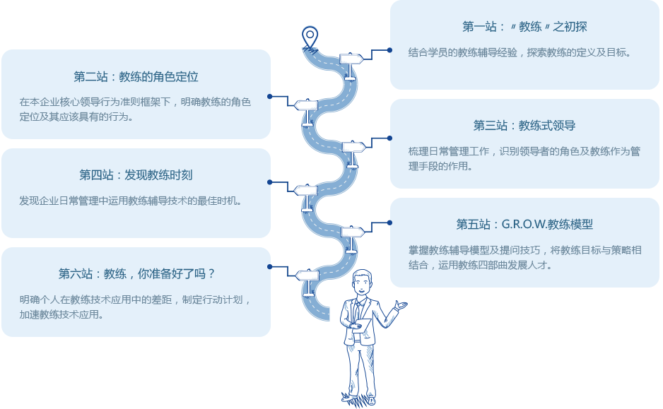 独家开发“六站式”情景化学习,学员通过在不同场景中的转换与探索,深刻体会教练辅导技术。